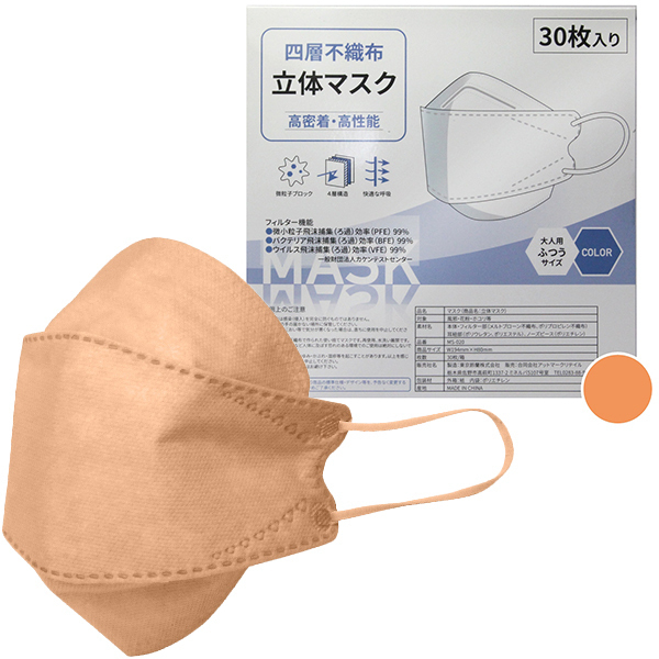 風邪・花粉・ウイルス対策に♪四層不織布立体マスク(アプリコット)の30枚入りです!大人用の普通サイズで高性能四層不織布立体マスク!微小粒子飛沫捕集率(ろ過)効果(PFE)99%。