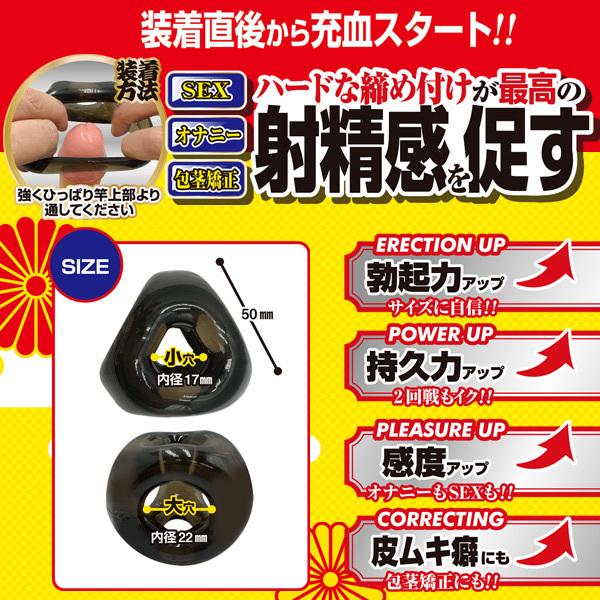 根元&竿&玉の3点をハードに締め上げ、最高の射精感を促します!SEX中の激しいピストンでも抜ける心配もありません。