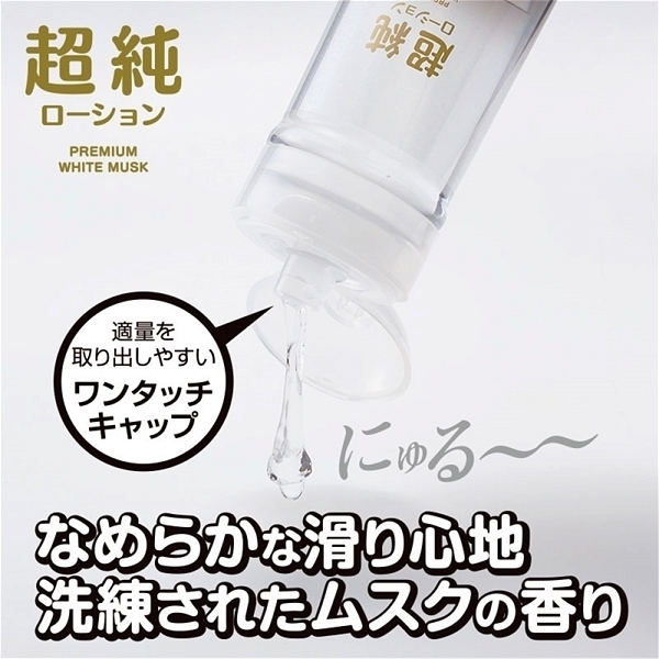 甘く官能的な香りで多くの女性からの支持も抜群!ホワイトムスクの香りが漂いつものプレイをより印象的なものにしてくれます♪安心の国内工場製造で品質も申し分なし!安心してあらゆるシチュエーションやプレイにお使いいただけます♪ローション選びに迷ったら、超純!#ぜひ、この潤いをお楽しみください。