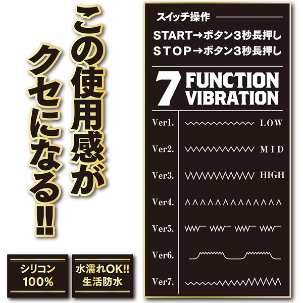 ゆっくりあせらず開発していきましょう!冒険の先には、未知の快感とアブノーマルな世界があなたをお待ちしています!!ファンクションは、7ファンクションを搭載!!弱⇒中⇒強とバイブレーションが進み、その後は7種類の多彩な振動になっています。