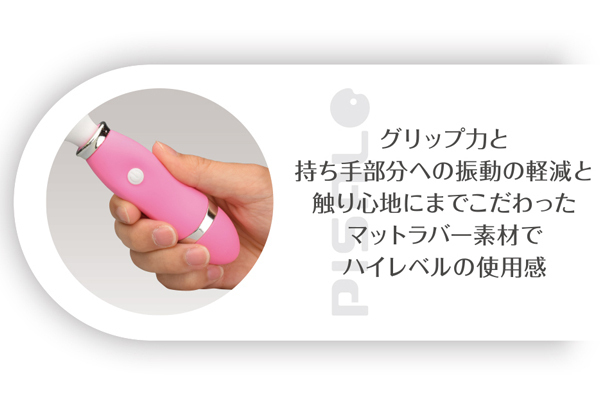 アクションは12種類搭載!持ち手にはマットラバーを、ヘッドには柔らかな医療用シリコンを採用し長時間のプレイにも対応、メンテナンスしやすい生活防水設計。