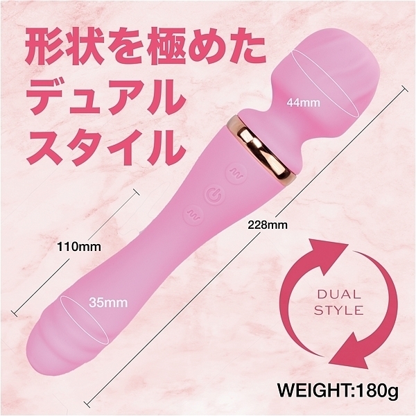 パッケージ:25.0×9.0×5.0cm 本体:全長22.8cm・電マ直径4.4cm・バイブ最大径3.5cm・挿入部全長11.0cm 重量:180g USB充電式